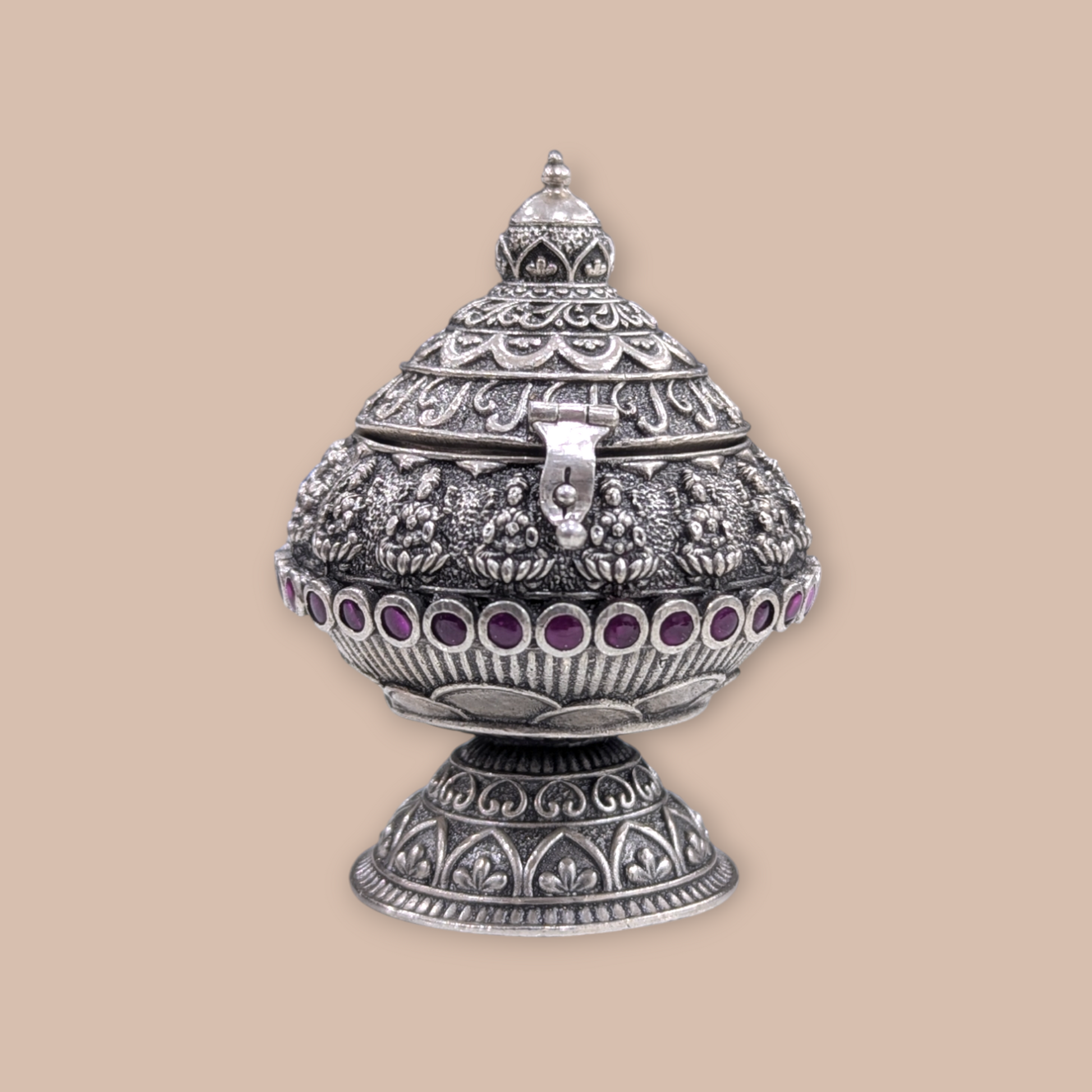 The 92.5% silver content ensures durability and a radiant shine, while the intricate detailing showcases expert craftsmanship. This bharani is designed to hold kumkum, enriching your rituals and pooja ceremonies with its functional beauty.