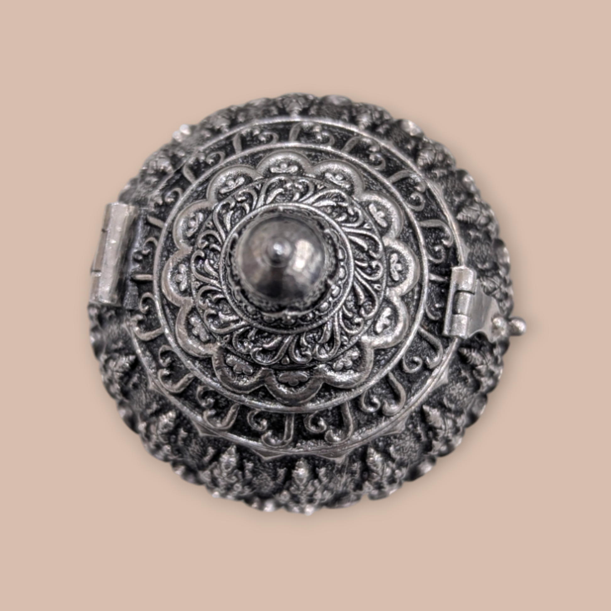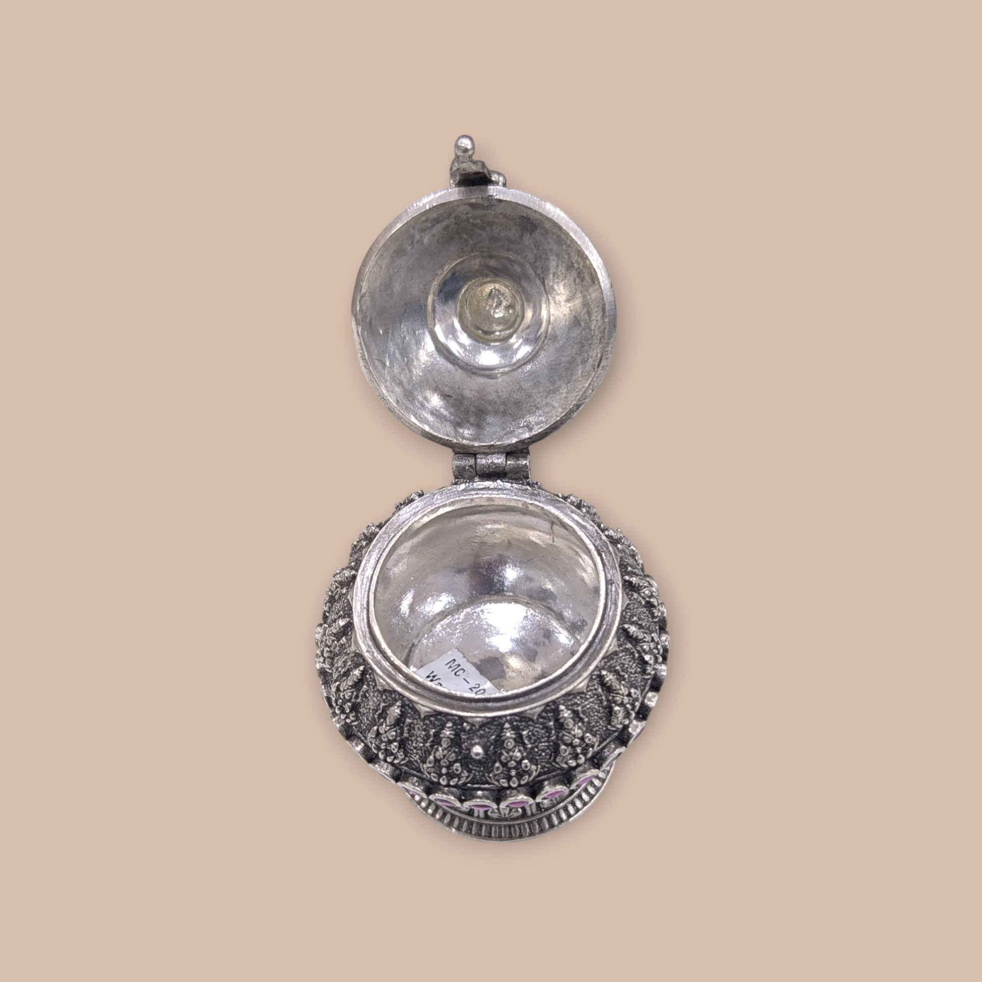 Introducing our 92.5% Silver AntIque Kumkum Bharani, a stunning piece that beautifully marries tradition with elegance. Crafted from high-quality sterling silver, this kumkum bharani features a unique ant motif, symbolizing diligence and community, making it a meaningful addition to your spiritual practices.