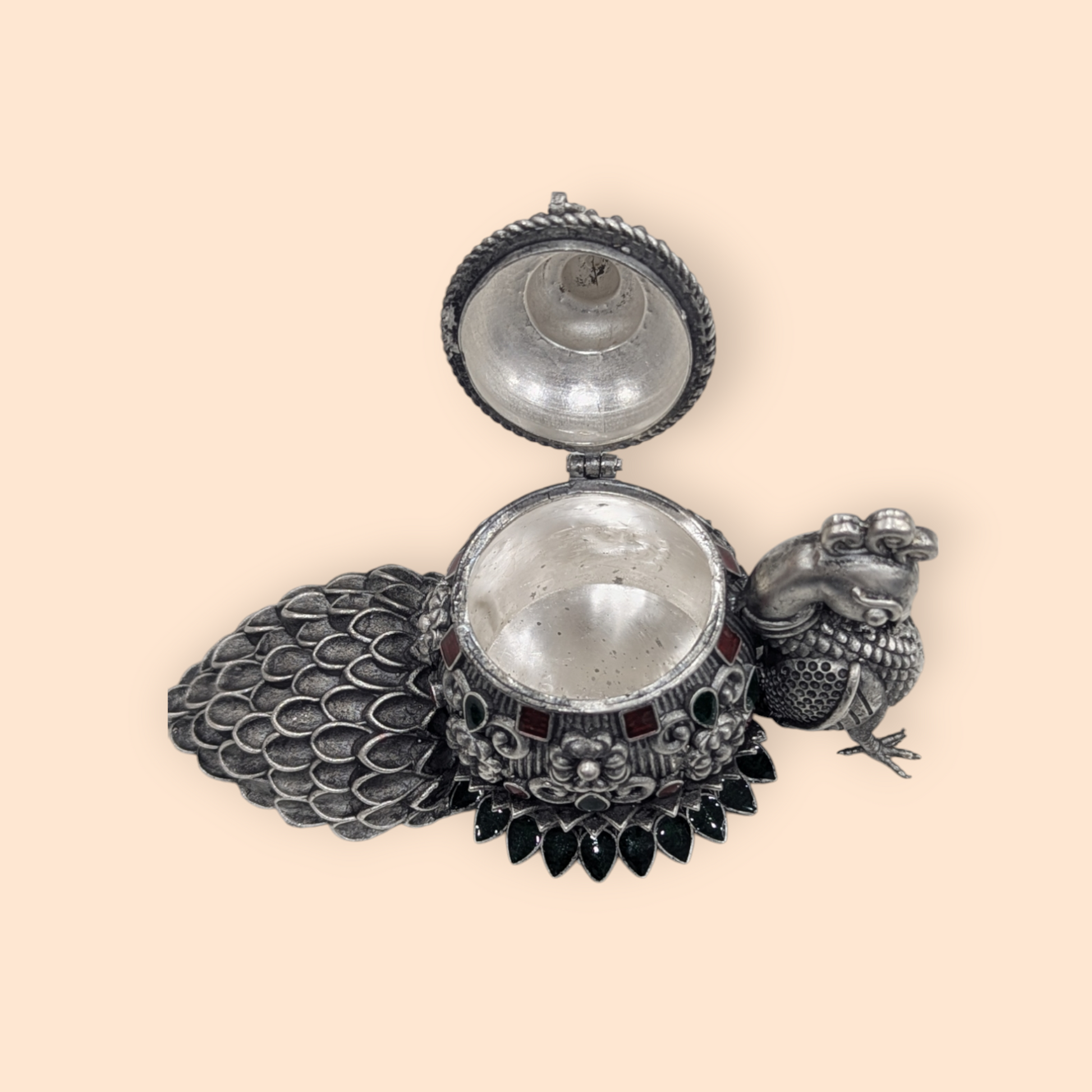 Embrace tradition with a modern twist—our Silver Emerald Kumkum Bharani is not just a utility item; it’s a statement of devotion and beauty. Perfect for festivals, weddings, or daily prayers, this exquisite piece is a must-have for every spiritual seeker.