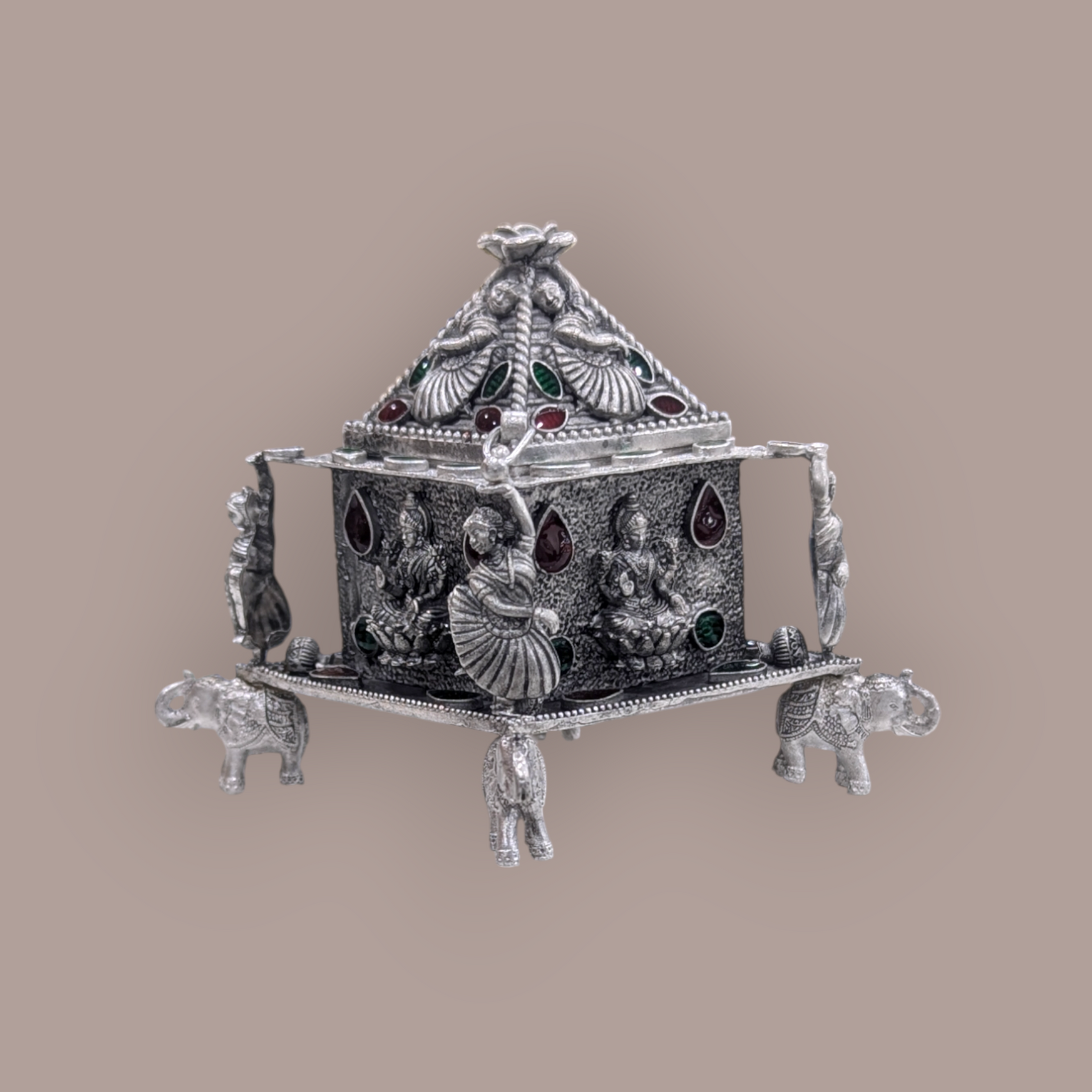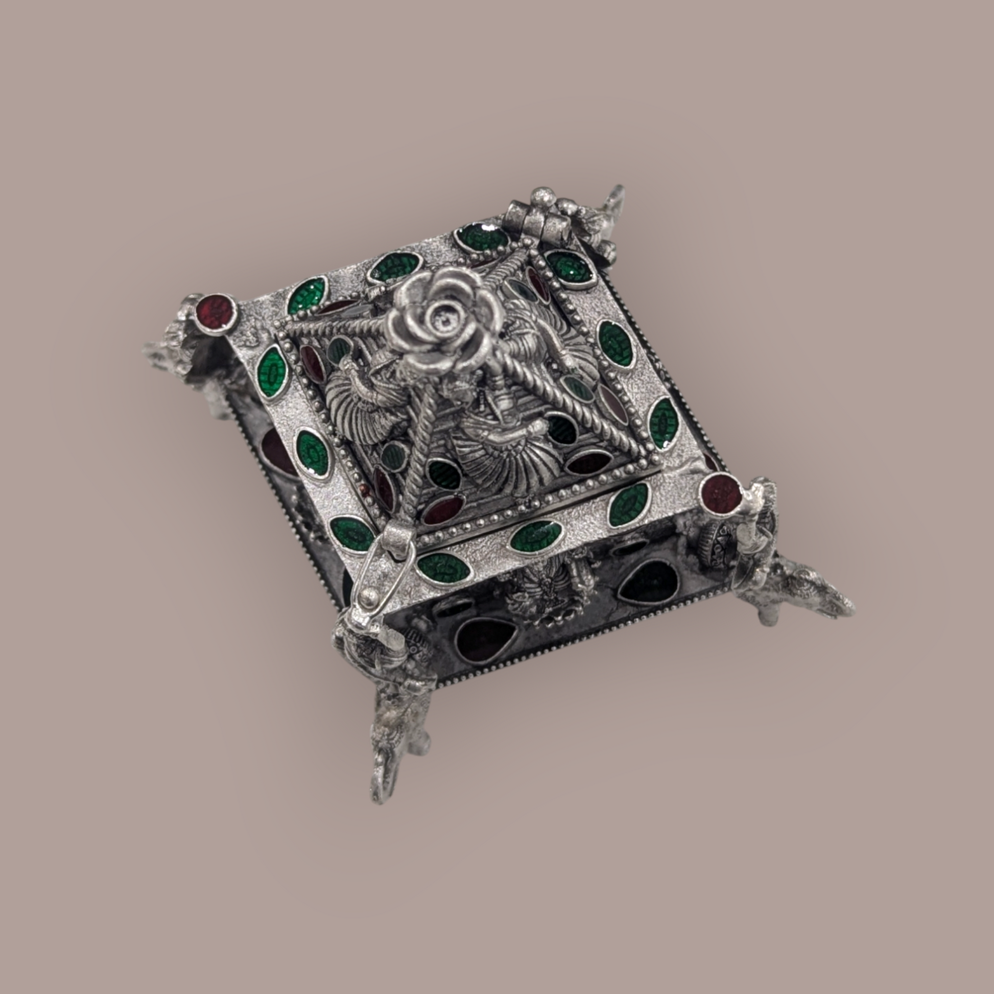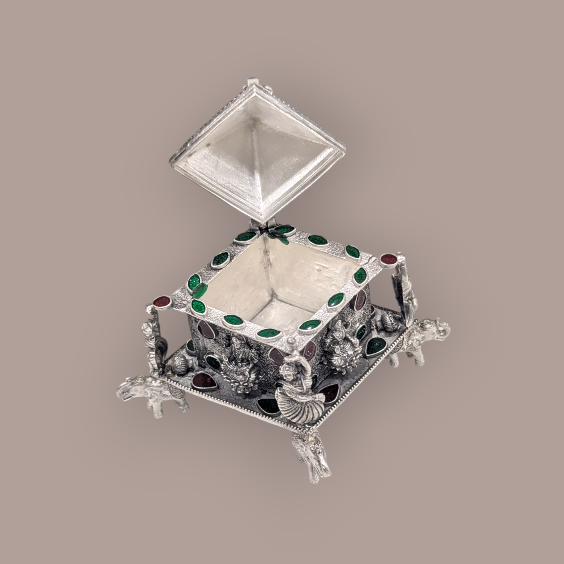 Embrace tradition with a modern twist—our Silver Emerald Kumkum Bharani is not just a utility item; it’s a statement of devotion and beauty. Perfect for festivals, weddings, or daily prayers, this exquisite piece is a must-have for every spiritual seeker.