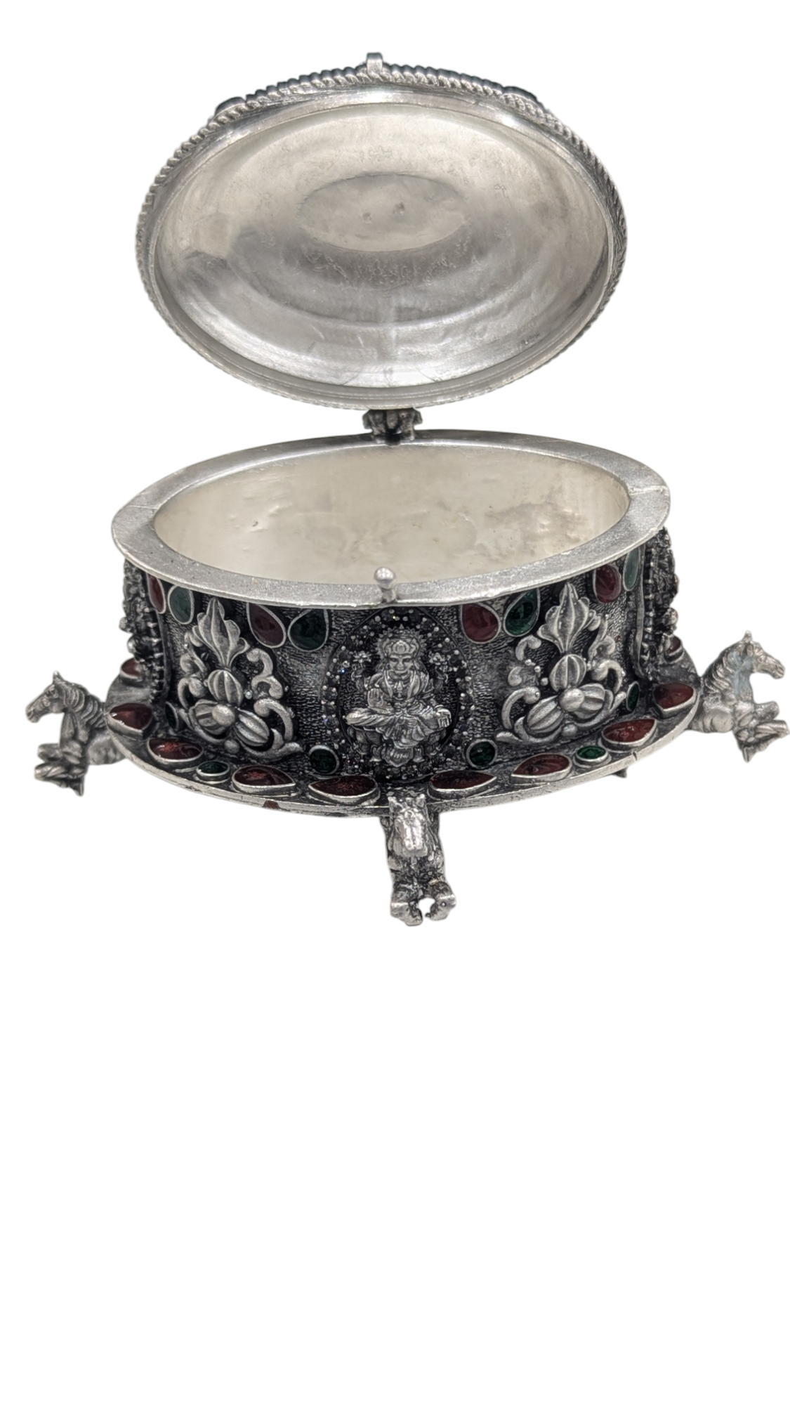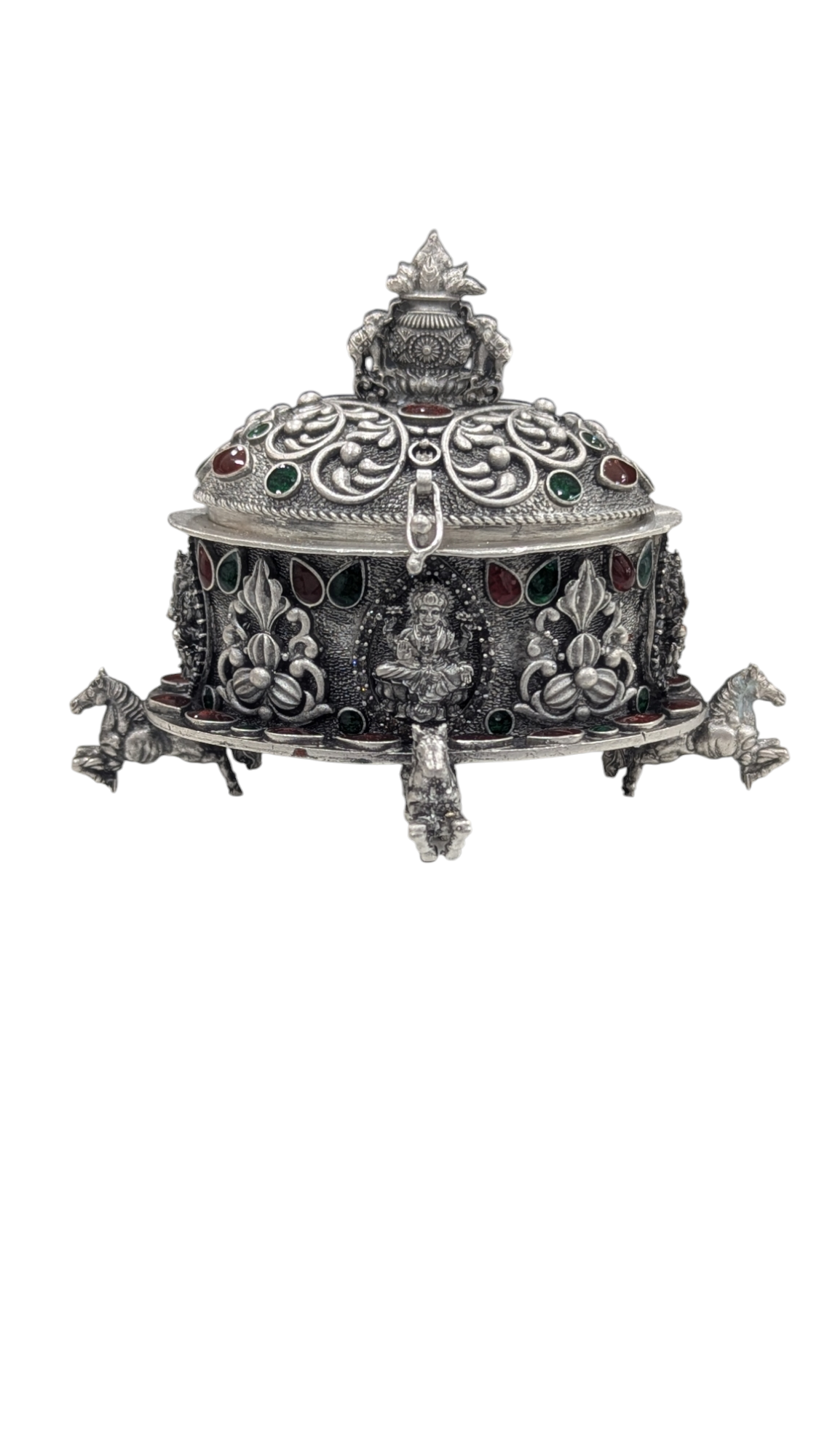 Embrace tradition with a modern twist—our Silver Emerald Kumkum Bharani is not just a utility item; it’s a statement of devotion and beauty. Perfect for festivals, weddings, or daily prayers, this exquisite piece is a must-have for every spiritual seeker.