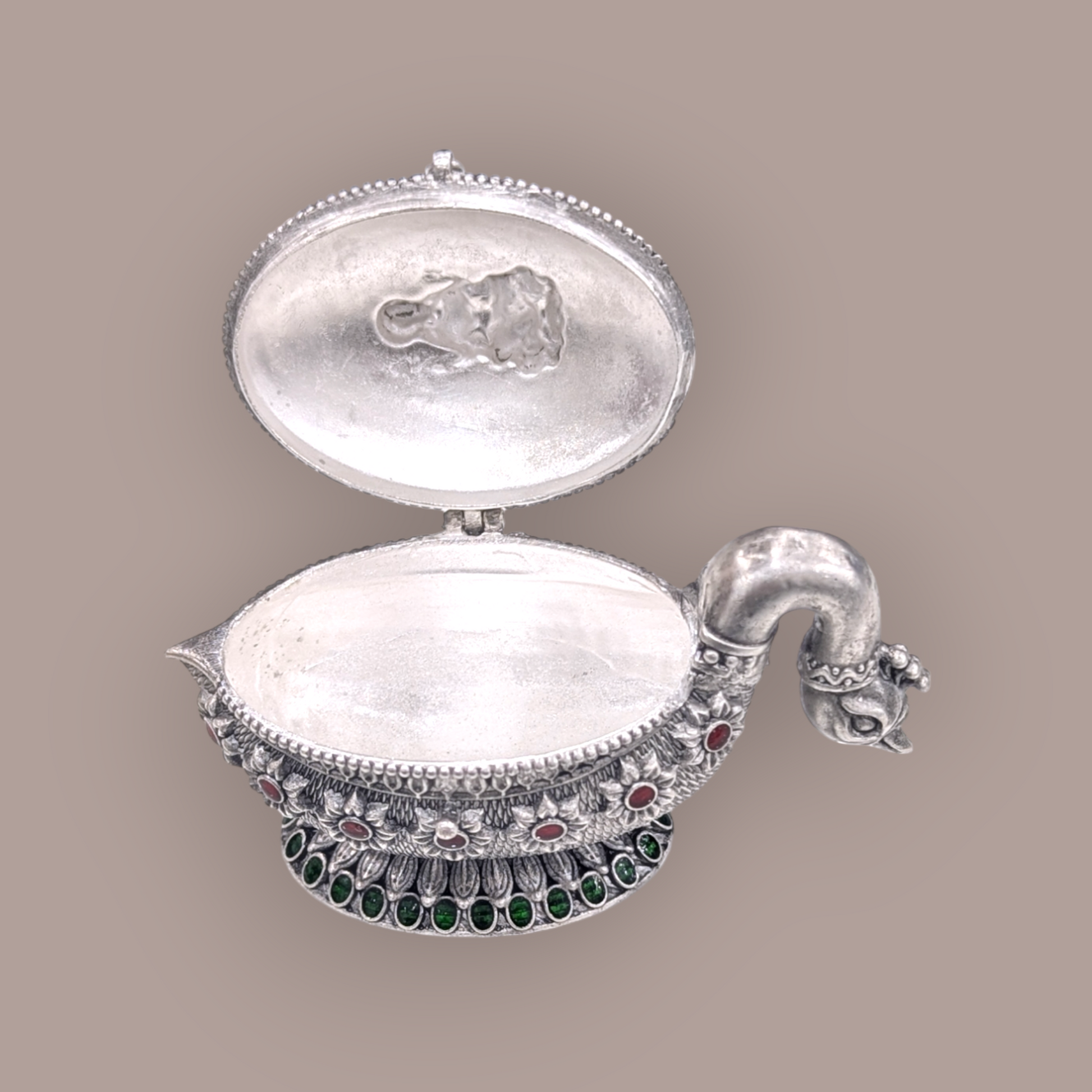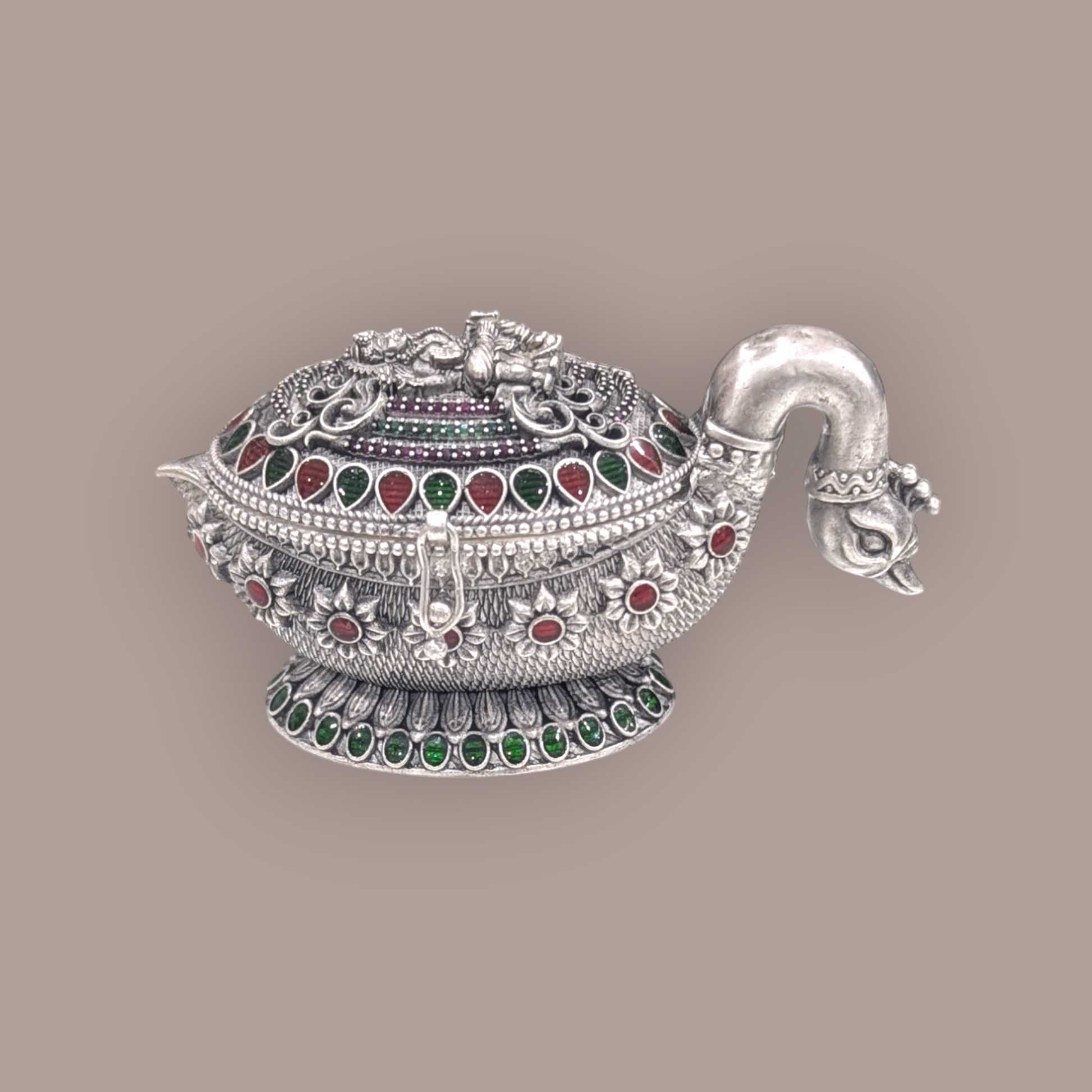 Embrace tradition with a modern twist—our Silver Emerald Kumkum Bharani is not just a utility item; it’s a statement of devotion and beauty. Perfect for festivals, weddings, or daily prayers, this exquisite piece is a must-have for every spiritual seeker.