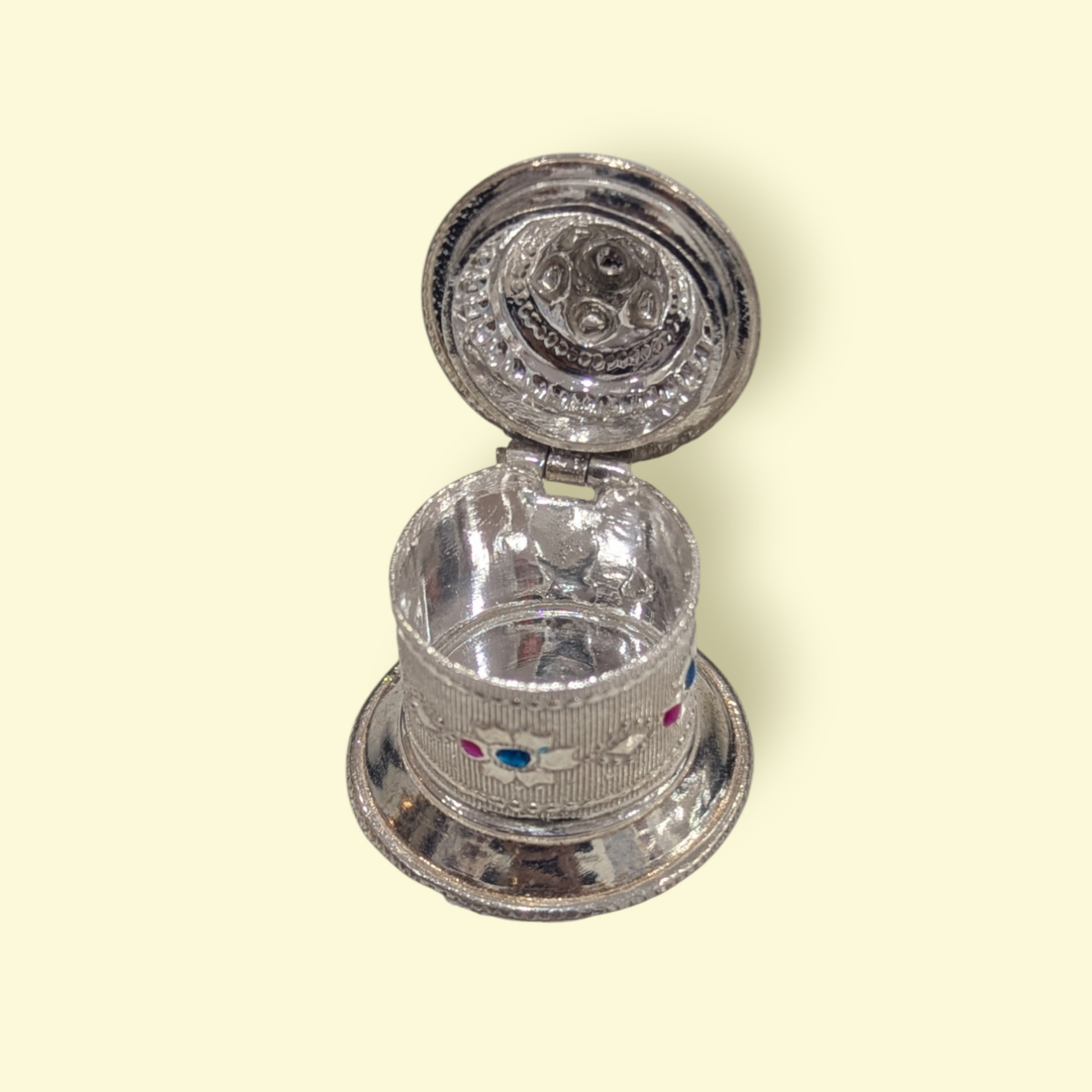 Introducing our beautifully crafted Silver Kumkum Bharani, a perfect blend of tradition and elegance. This essential item for your puja rituals is designed to hold kumkum, symbolizing prosperity and blessings in Hindu culture.