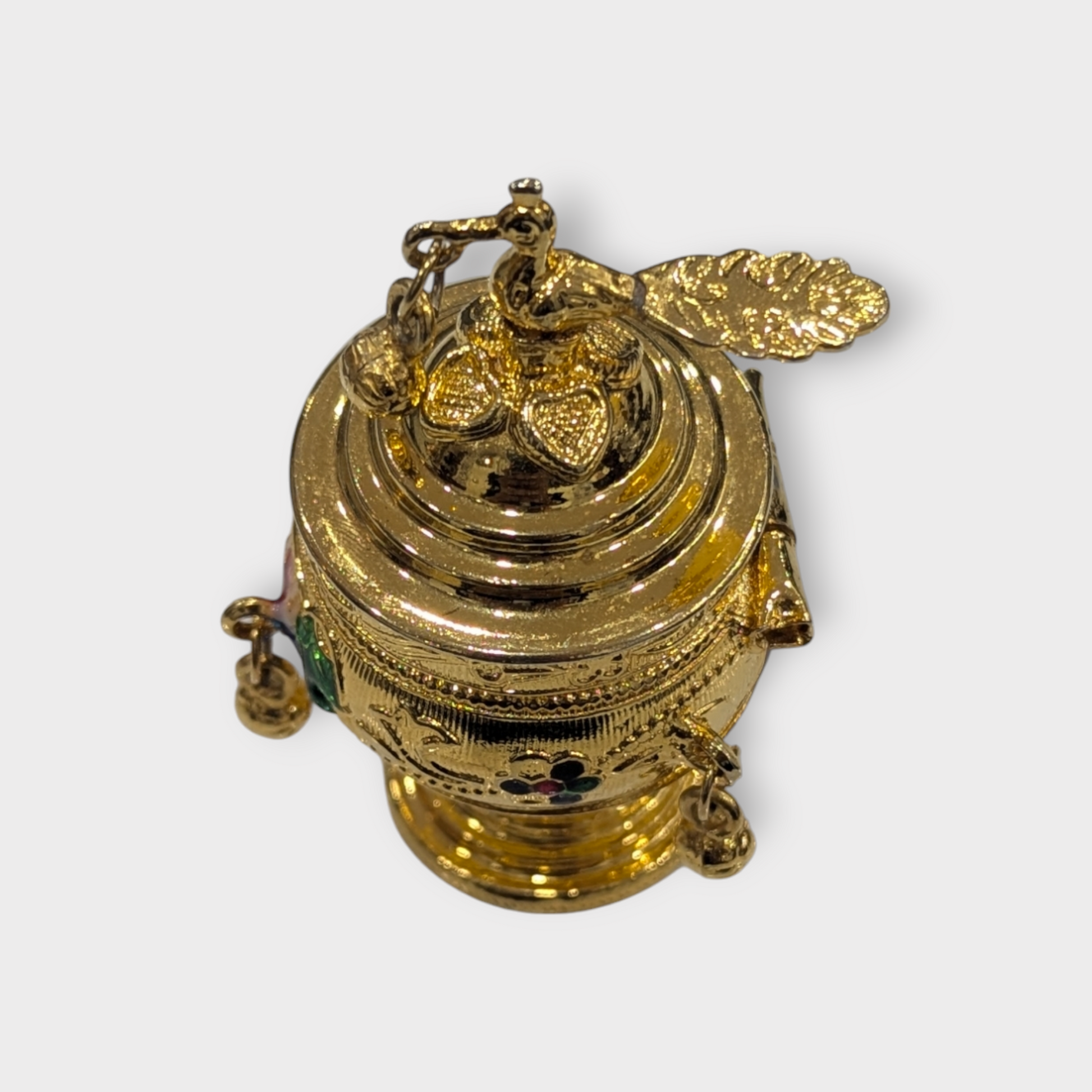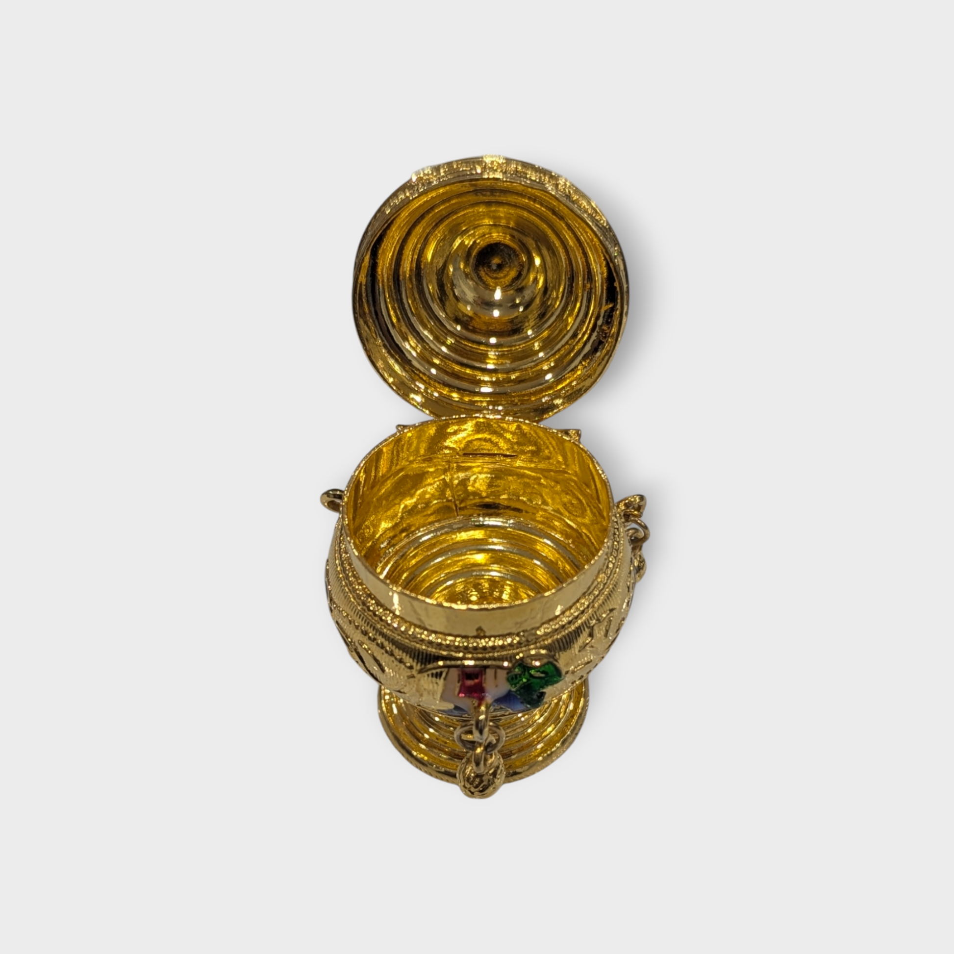 Introducing our exquisite Gold Coated Silver Kumkum Bharani, a stunning blend of tradition and elegance. This beautifully crafted vessel is designed to hold kumkum, a sacred powder used in Hindu rituals, symbolizing prosperity and well-being.
